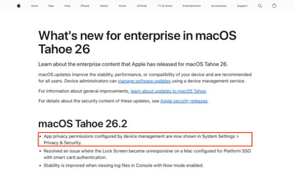 PPPC device management settings visible in System Settings on macOS Tahoe 26.2.0