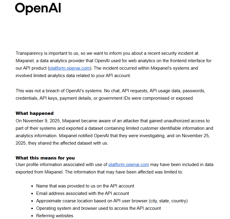 OpenAI data may have been exposed after a cyberattack on analytics firm Mixpanel