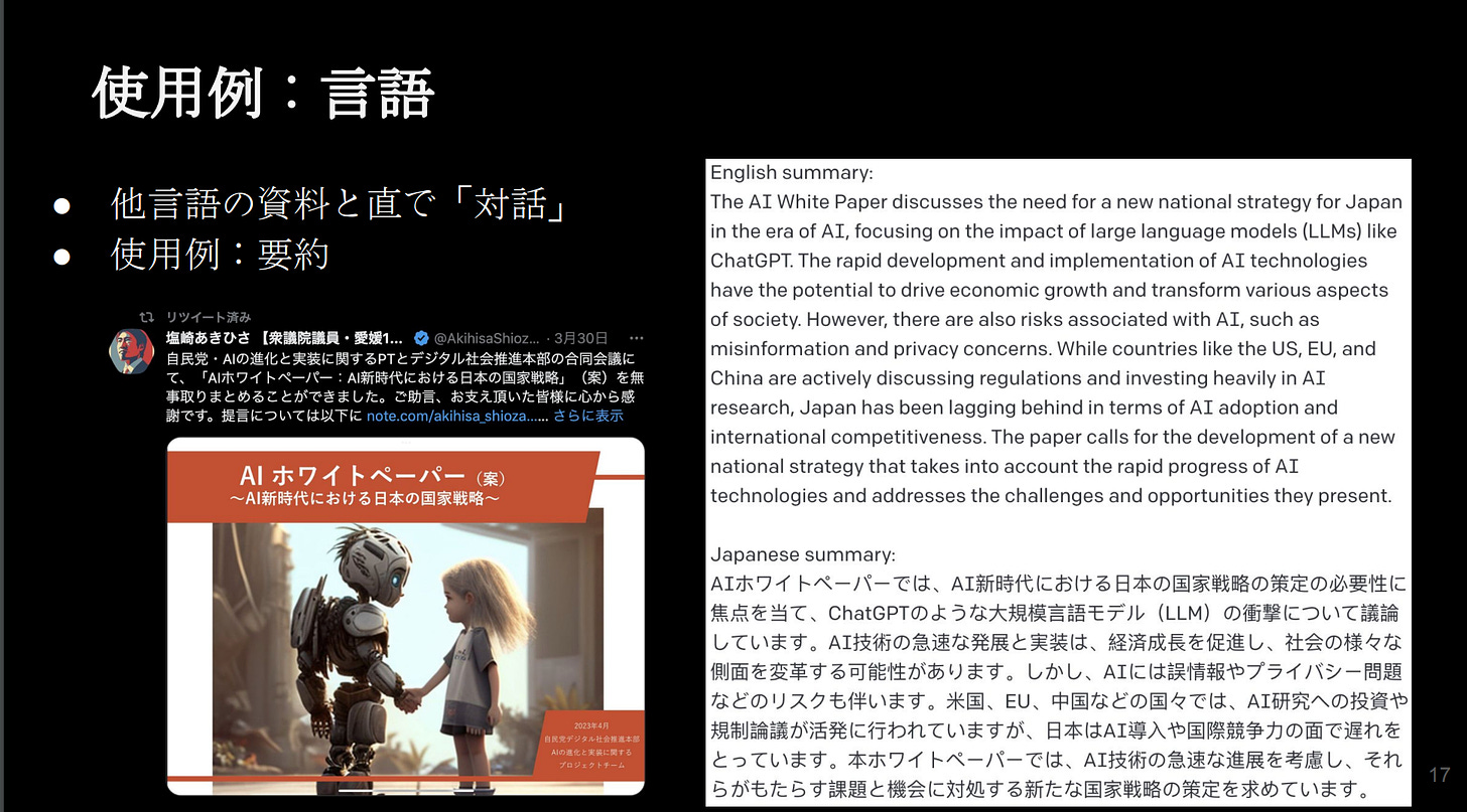 4月10日,#openai 的CEO @sama 在日本自民党的AI发展第九次会议上以【ChatGPT的活用和其他技术以及对日本的建议】为题做了宣讲,众议院议员 塩崎あきひさ 将上传了可公开的资料,其...