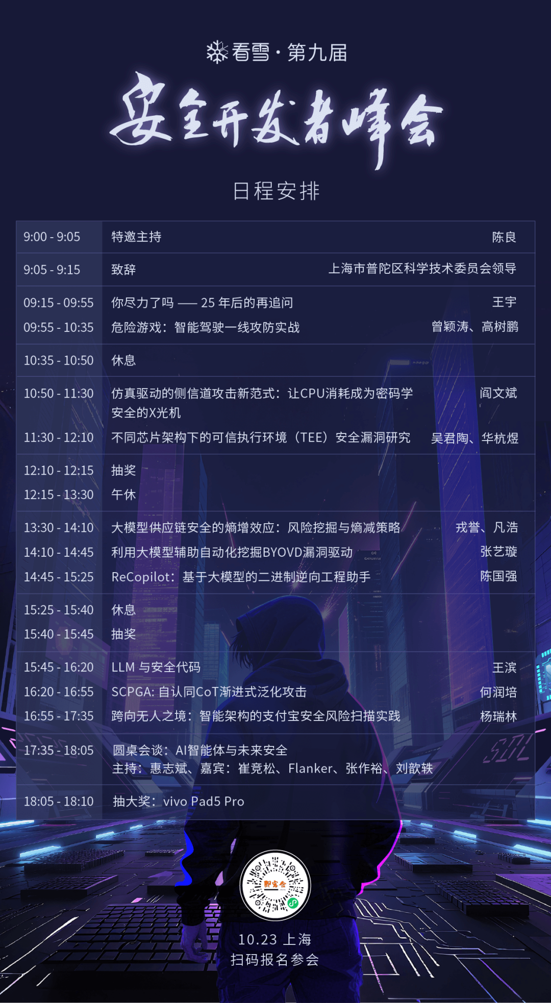 第九届安全开发者峰会(SDC2025)将于2025年10月23日在上海龙之梦大酒店举办,聚焦AI智能体与未来安全等议题。峰会包含圆桌会谈、安全训练营及极客市集等活动,汇聚顶尖专家探讨技术发展与安全挑战。...