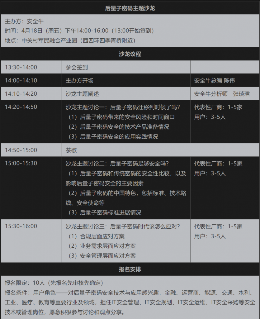 活动邀请 | 后量子密码主题沙龙:名额有限,报名从速