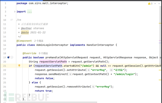 下载地址https://github.com/StarSea99/starsea-mall然后根据要求配置环境,配置Maven 数据库配置完成好可以启动页面开始审计,经典的一个目录在intercept...