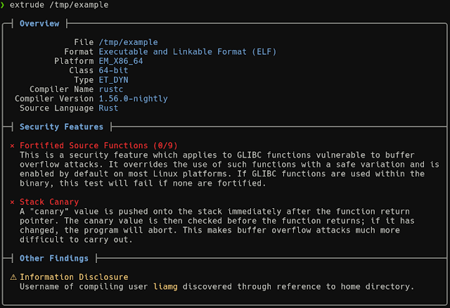 Analyse binaries for missing security features, information disclosure and more. Extrude is i...
