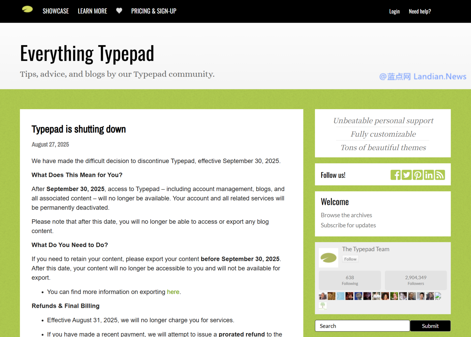 付费博客平台Typepad宣布在9月30日停止服务 用户必须提前导出所有博客