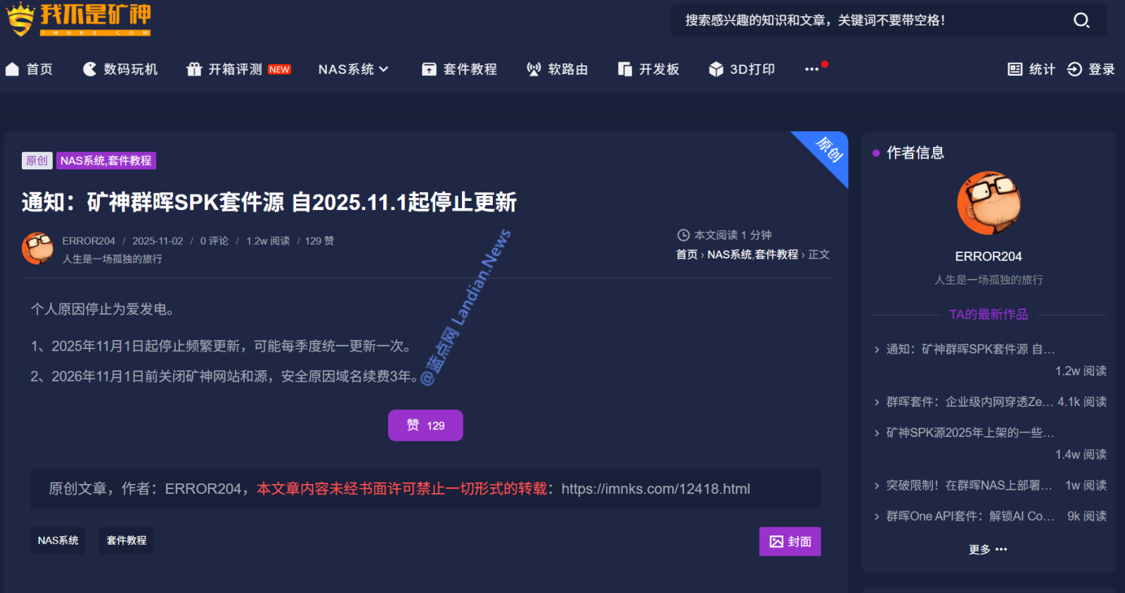 群晖NAS社区套件源「我不是矿神」停止更新 11月1日起关闭网站和下载功能