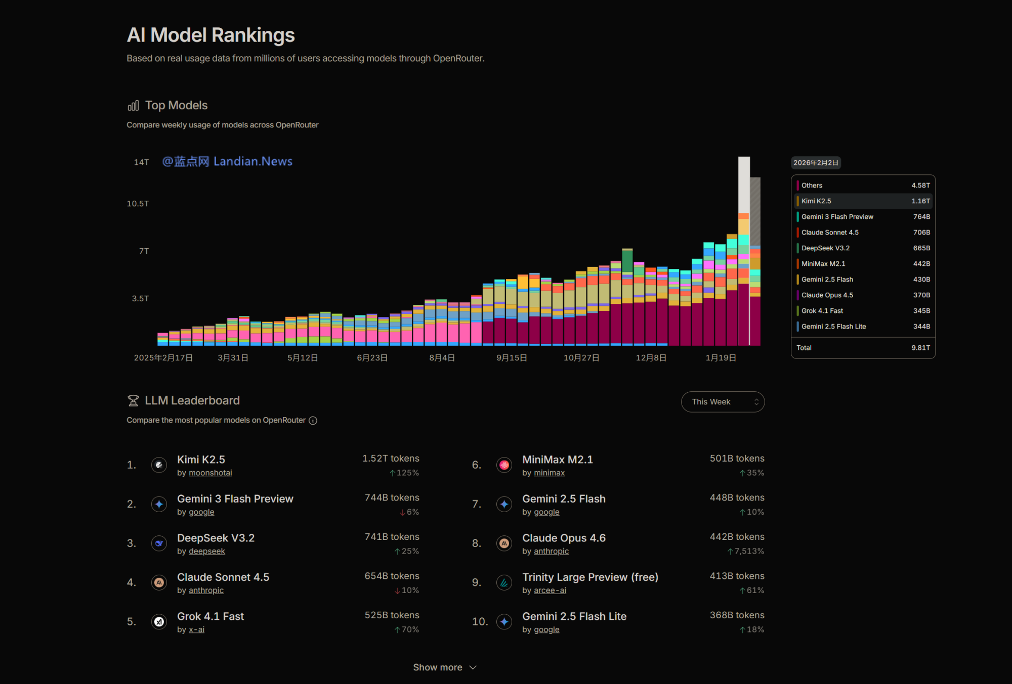 月之暗面K2.5模型称霸OpenRouter付费调用排行榜 调用量远超其他模型