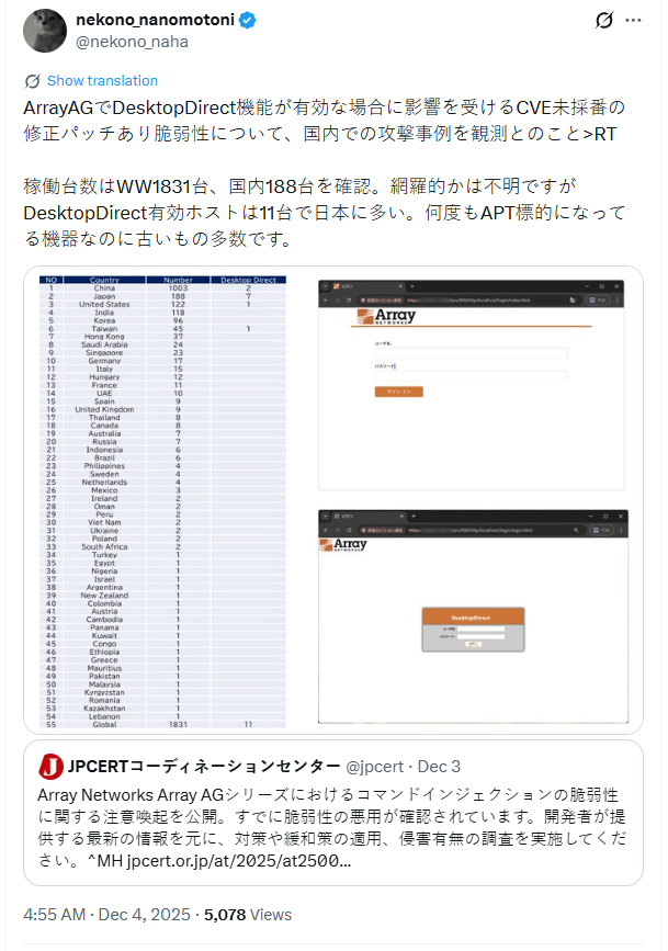 嗯,用户让我帮忙总结一下这篇文章的内容,控制在一百个字以内,而且不需要用“文章内容总结”或者“这篇文章”这样的开头,直接写描述就行。首先,我需要仔细阅读这篇文章,理解其主要内容。 文章讲的是威胁行为者利用Array AG系列VPN设备中的一个命令注入漏洞植入网络shell,并创建流氓用户。Array Networks已经在5月份的安全更新中修复了这个漏洞,但没有分配标识符,这使得追踪和补丁管理变得复杂。日本的计算机紧急响应小组(CERT)发布了一个警告,指出黑客自8月以来一直在利用这个漏洞攻击日本的组织。攻击源自IP地址194.233.100[.]138。漏洞影响ArrayOS AG 9.4.5.8及更早版本,包括启用了“DesktopDirect”远程访问功能的AG系列硬件和虚拟设备。JPCERT建议升级到版本9.4.5.9,并提供了如果无法升级的变通方法:禁用DesktopDirect服务或使用URL过滤阻止包含分号的URL访问。Macnica的安全研究员Yutaka Sejiyama报告称,全球有1,831个ArrayAG实例,主要分布在中国、日本和美国。至少有11个主机启用了DesktopDirect功能。由于用户主要集中在亚洲,特别是日本受到攻击较多,日本以外的安全厂商和组织没有给予足够关注。BleepingComputer联系了Array Networks询问是否计划发布CVE-ID和官方公告,但截至发布时间未收到回复。 现在我需要将这些信息浓缩到100字以内。重点包括:漏洞被利用、影响范围、修复情况、建议措施、以及用户分布情况。 可能的总结结构: 威胁行为者利用Array AG系列VPN设备中的命令注入漏洞植入网络shell并创建流氓用户。该漏洞影响ArrayOS AG 9.4.5.8及更早版本,并已被修复但未分配标识符。攻击源自特定IP地址,主要针对日本组织。建议升级或禁用相关功能以缓解风险。 检查字数是否在限制内,并确保信息准确且关键点都涵盖。 </think> 威胁行为者利用Array AG系列VPN设备中的命令注入漏洞植入网络shell并创建流氓用户。该漏洞影响ArrayOS AG 9.4.5.8及更早版本,并已被修复但未分配标识符。攻击源自特定IP地址,主要针对日本组织。建议升级或禁用相关功能以缓解风险。...