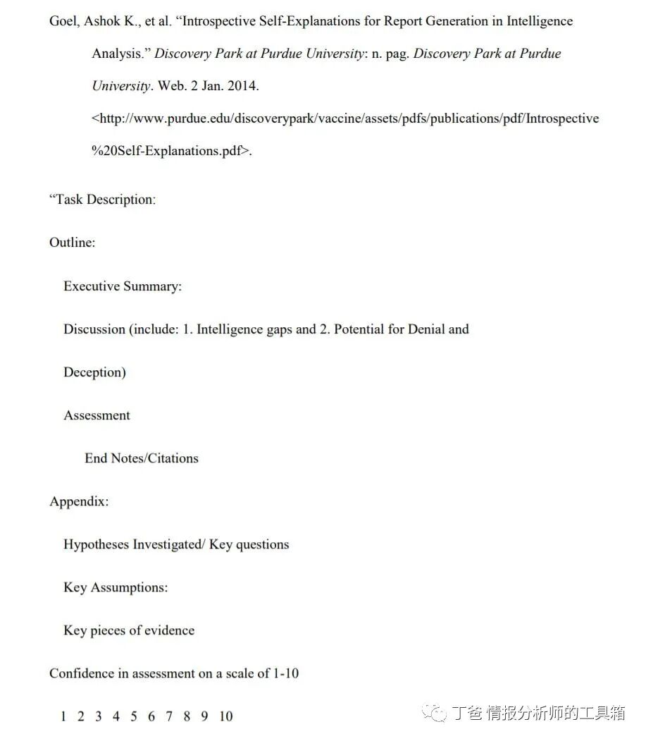 参考附录B的替代类似的情报分析报告模板。在报告末尾列出的信息来源应按情报文件编号列出。来源也可以直接整合成一个句子,”也就是说,根据《经济学人》,首相将反对这项立法。”有关被引用的更多信息,包括那些未被情报文件编号引用的信息,见附录A。