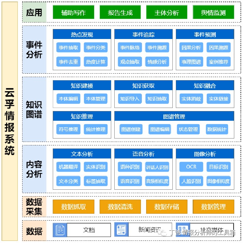 YFINT的核心在于对多模、多源的异构数据的高效处理分析与可视化展示,对开源情报中的非结构化文本内容进行分析,挖掘有价值的事件、知识并以结构化的方式展示。其系统架构图及情报分析流程如下所示: