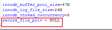 我们可以在mysql/my.ini中查看是否有secure_file_priv 的参数,如果没有的话我们就添加 secure_file_priv = ' ' 即可