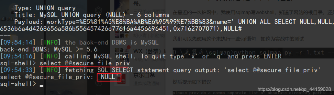 在最近的一次护网中,我使用sqlmap写webshell,知道了网站的根目录,还是写不进去。就是由于secure_file_priv的值为NULL。那怎么知道这个值是什么了