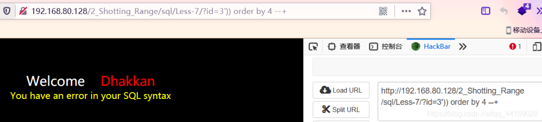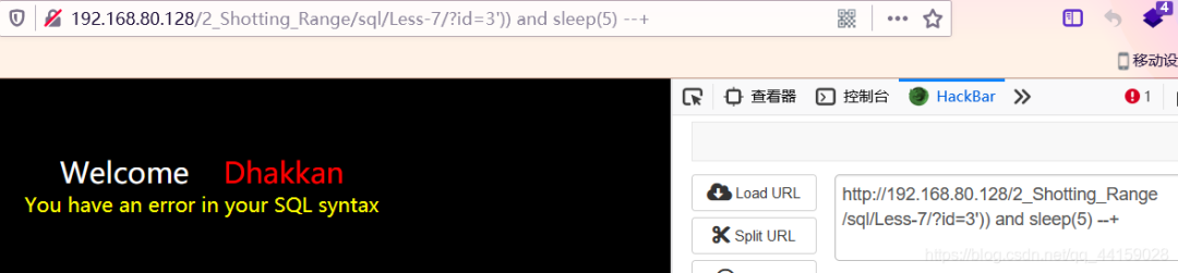 输入正确的语法正常显示,错误的语法显示说语法错误,页面只存在两种状态,判断为盲注。我们输入?id=3')) and sleep(5) --+时长成功延时,所以注入点就为3')),我们输入的字符被包含在单引号中,且单引号外有两个双引号包裹
