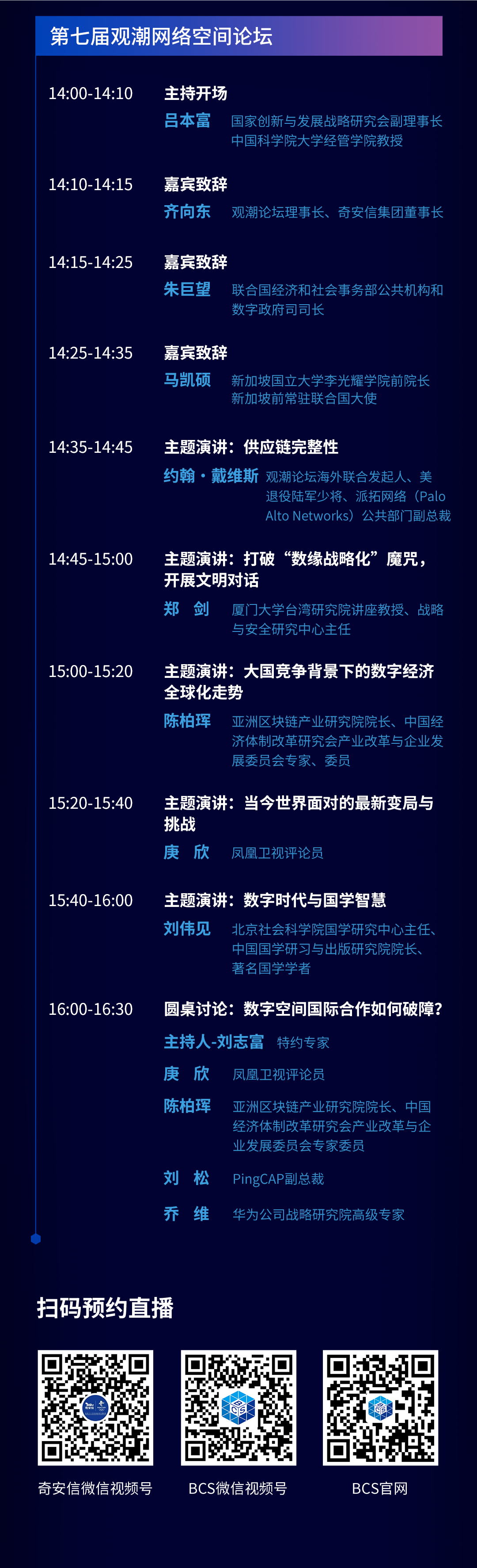 明日午间,奇安信威胁情报运营系统TIOS、服务器威胁分析服务、奇安信SSL编排器、奇安信漏洞情报服务,四大成果将重磅发布,展现奇安信在北京冬奥“零事故”成果背后的“软实力”。午后,第七届观潮网络空间论坛蓄力开启。论坛将延续一直以来国际化、多元化、跨领域的网络空间交流平台和高端智库能力,聚焦“挑战,格局,改变——人文智慧为数字时代领航”议题,就网络空间全球治理、网络空间规则制定、网络安全、网络犯罪治理、数据跨境流动、隐私保护、数字经济、人工智能等深入沟通,探讨数字时代发展的新趋势及有效的应对策略。![]()