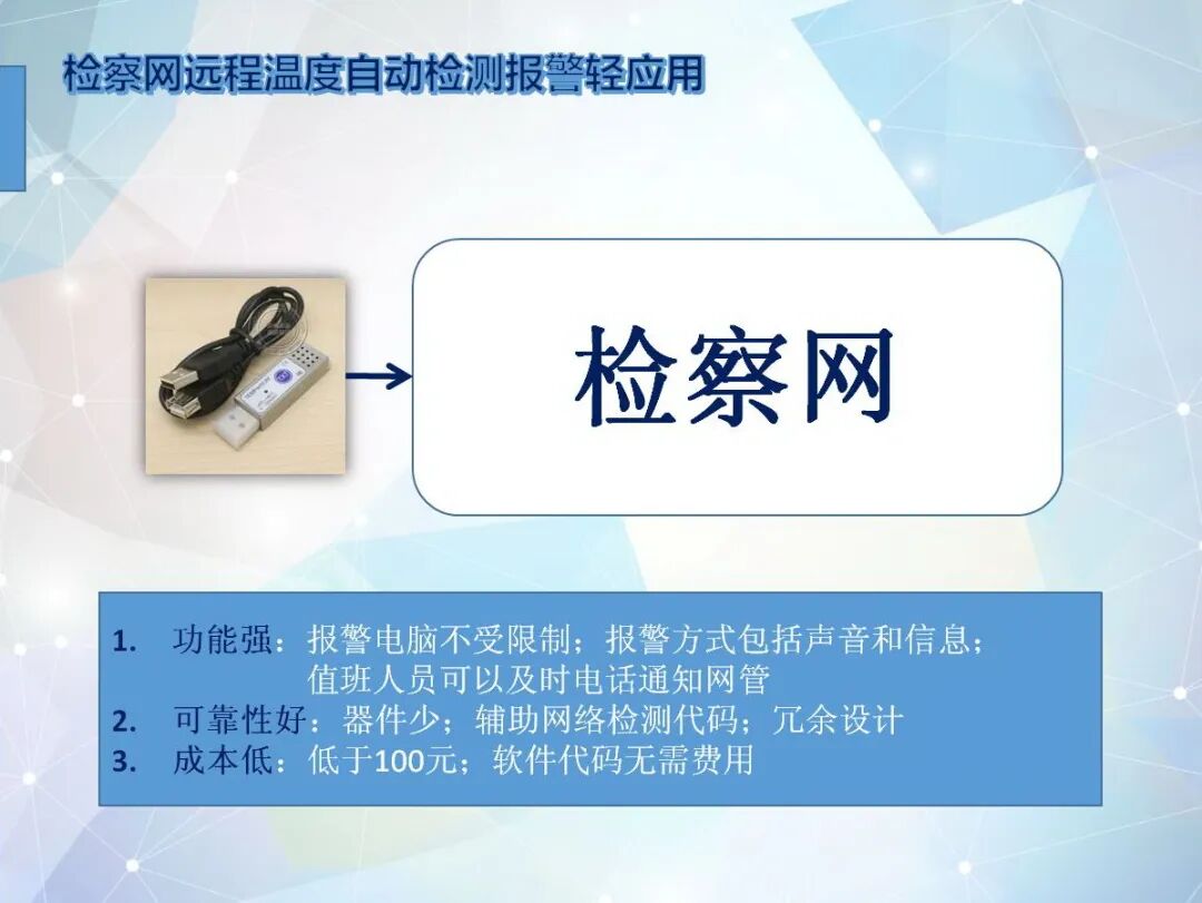 为解决此隐患,他在USB温度传感器的基础上,自主编写CMD程序,远程读取机房温度,高温时自动通过网络报警,值班室可以根据其电脑报警,及时通知技术人员处理险情。