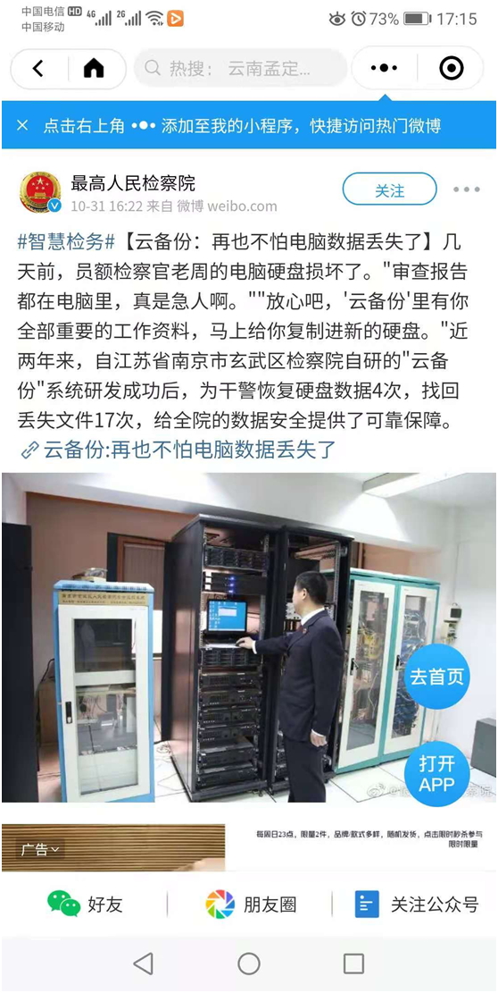 2017年,他立足现有条件,自研检察数据“云备份”系统,实现对检察院数据库、干警个人电脑的实时在线备份。通过该系统,多次找回干警急需的“遗失”文件,还及时恢复过整块硬盘数据。检察日报和最高检微博对该项创举进行了专栏报道。