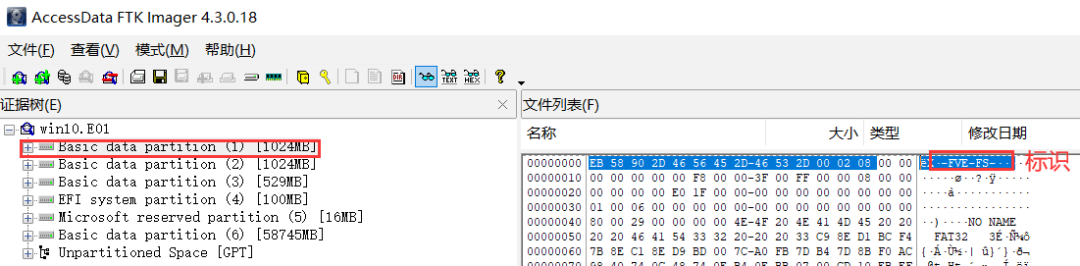 Imager或winhex加载证据盘或镜像文件,分别查看各分区的签名头,签名头为“-FVE-FS-”的即为Bitlocker加密分区,如下图所示: