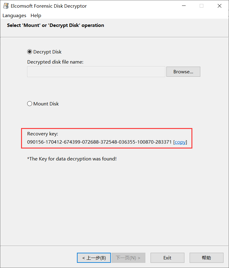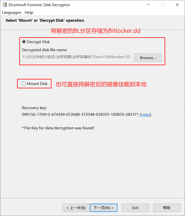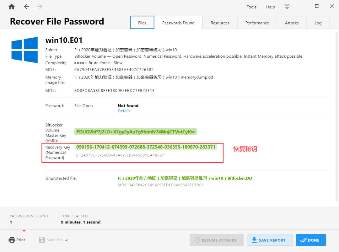 3)解密完成后,软件可以解析出Bitlocker解密的恢复密钥,也可会将解密后的Bitlocker加密分区另存到上图设置的目标路径,通过恢复密钥即可解密Bitlocker,也可以直接加载解密后的镜像即可取证。