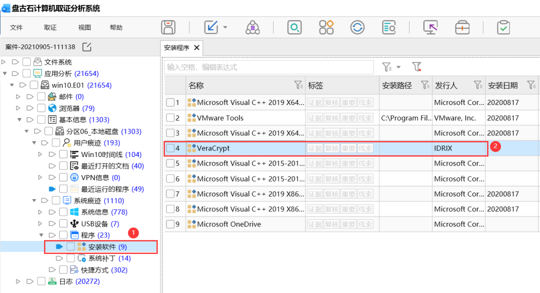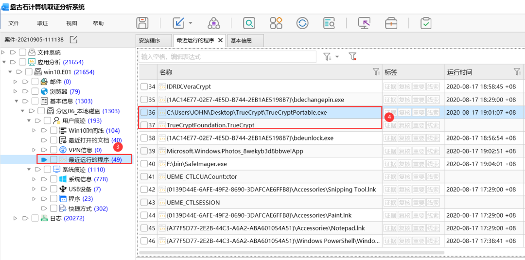 TrueCrypt加密之后的文件没有固定的特征,无法通过特征去进行判断,在取证过程中,我们可以通过取证软件分析证据盘内安装的软件和最近打开的程序,如果嫌疑人有安装过和使用过TrueCrypt,则可以猜测存在TrueCrypt加密容器文件或分区,如下图所示: