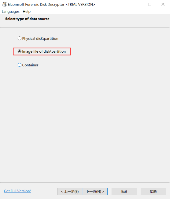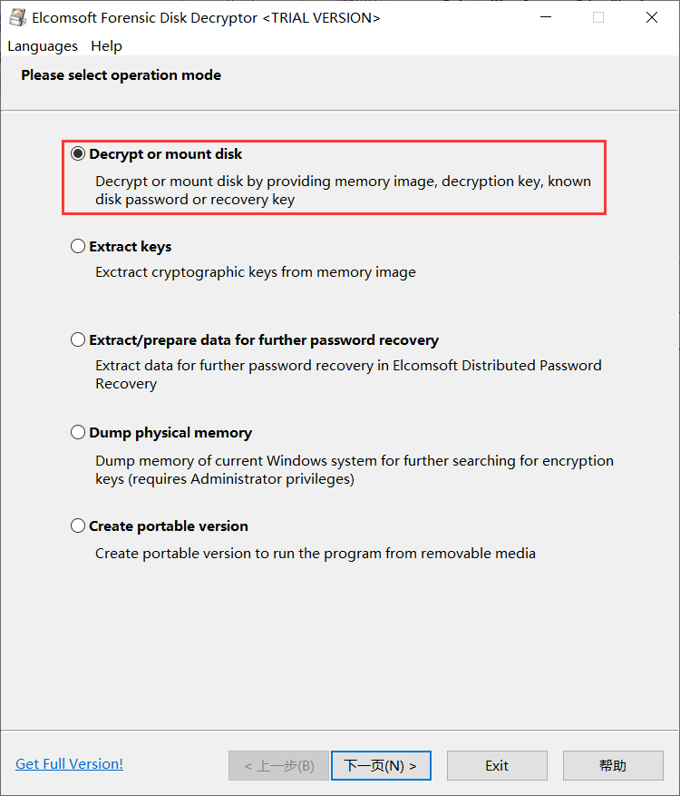 1)打开软件,选择“Decrypt or mount disk”,下一步,然后根据实际选择物理磁盘/分区或镜像,下一步: