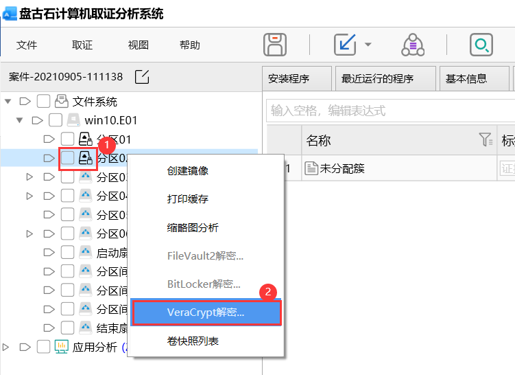 使用计算机取证分析系统加载镜像后,在加密的分区上会有一个小锁图标,在对应的分区上右键,若弹窗提示VeraCrypt解密,则判断可能为TrueCrypt加密卷。如下图所示: