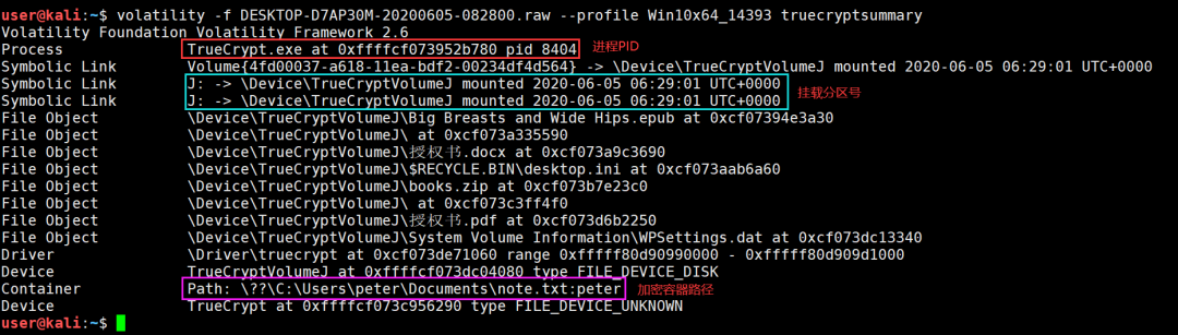 在上图中,不仅分析到了TrueCrypt的进程PID和加密容器文件路径、文件名,还可以分析出加密容器挂载的盘符和容器内的文件。