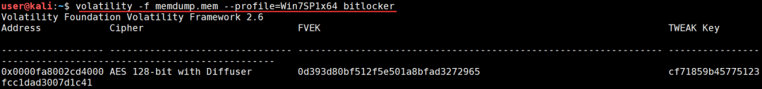 3)在kali里通过volatility与bitlocker.py插件提取内存镜像内的FVEK和TWEAK,执行命令