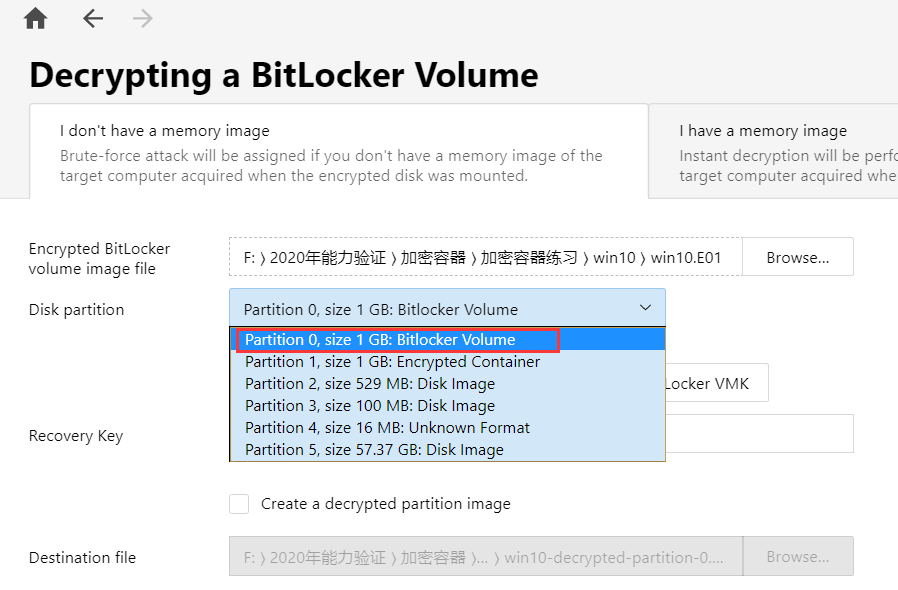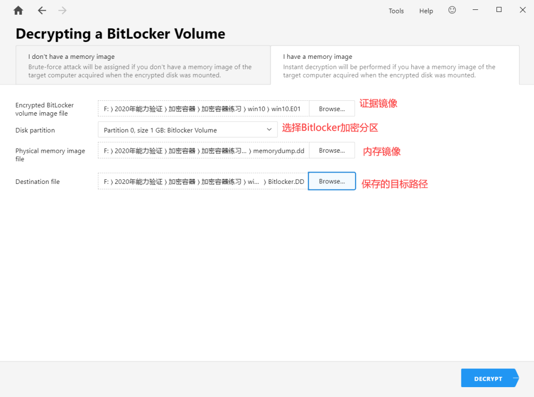 2)选择“I have a memory image”,弹窗后设置好需解密的加密容器、内存镜像、解密后镜像存放的位置和文件名,如下图所示: