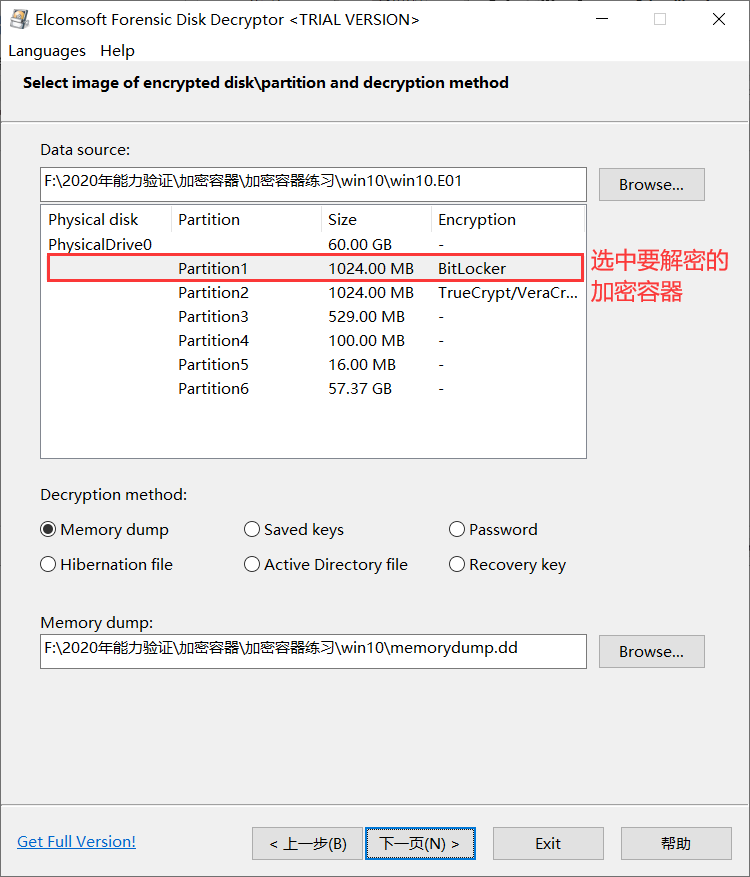 2)选择之后,软件会自动加载磁盘镜像,并识别对应的加密类型,选中软件识别出需要解密的Bitlocker加密容器,在下方会弹出解密方法,勾选“Memory Dump”,关联好内存镜像,点击下一步,开始解密分析: