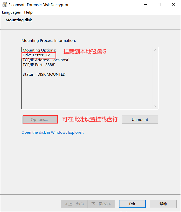 3)分析完成后,我们可以选择“Decrypt disk”将加密容器解密后另存到指定路径,然后直接通过镜像挂载工具加载解密后的镜像文件进行取证。我们也可以选择“Mount Disk”直接将加密分区挂载到本地,如下图所示: