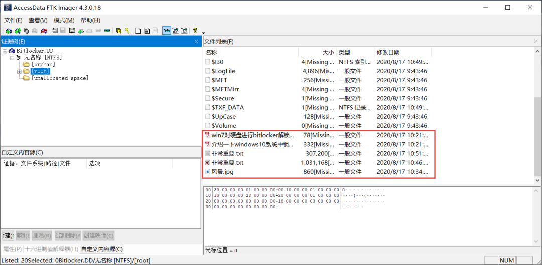 Bitlocker的签名开头为“-FVE-FS-”,我们可以使用“-FVE-FS-”签名头来识别Bitlocker加密容器。通过FTK