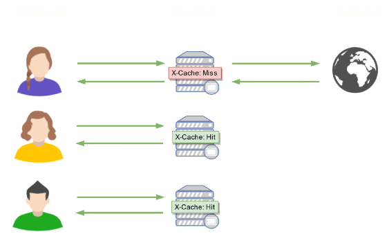如上图所示,假设小紫小黄小绿都在服务器划分的同一批特定请求中,那么小紫一开始访问服务器时,经过缓存键X-Cache: Miss的判定,是首次访问,所以直接连接到Server服务器,而其后的小黄、小绿再次访问相同的文件时就会被判定为X-Cache: Hit,即只需连接Cache缓存服务器,不再连接到Server服务器,借此减少了Server服务器的运行负荷