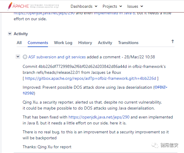 提交给Apache OFBIZ后认为这只是潜在的漏洞,不能直接触发,修复后给予致谢但无CVE