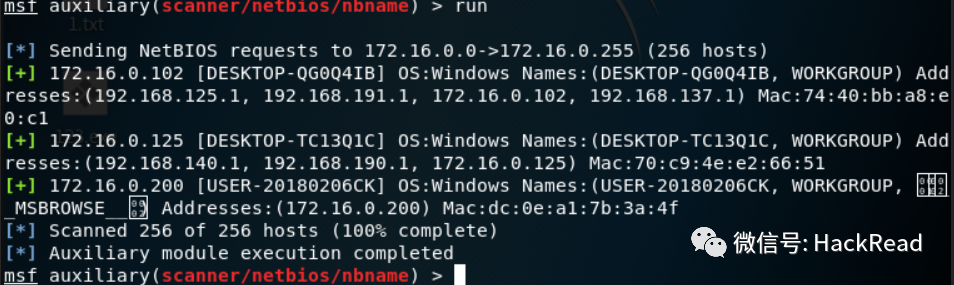 msf扫描 use auxiliary/scanner/discovery/arp_sweep