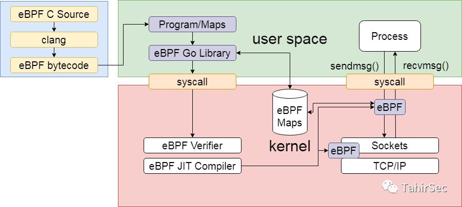 eBPF 程序的首先使用 C 或 Rust 编写 eBPF 程序,LLVM编译为字节码,用户态程序通过 eBPF 库,使用 bpf 系统调用将 eBPF 字节码加载到Linux 内核。