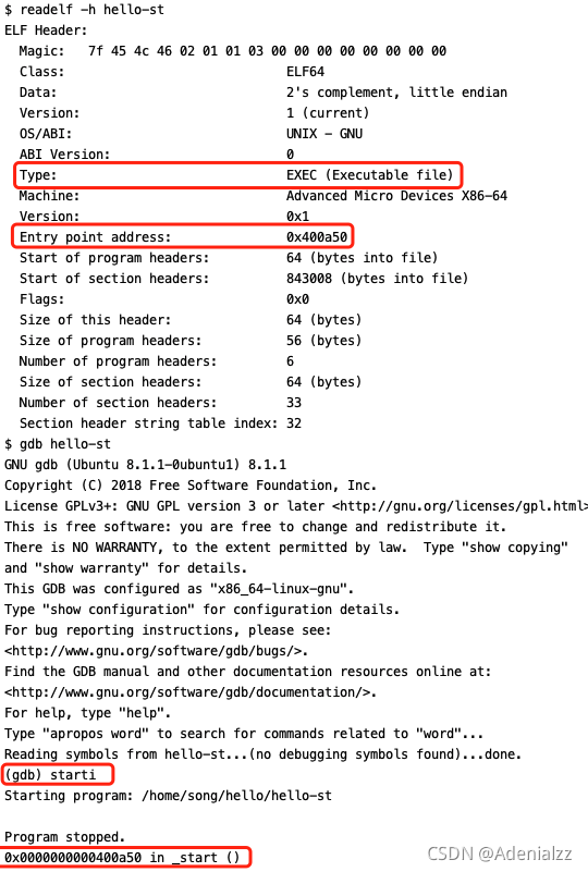 我们用readelf -h查看其入口地址,并在gdb中starti查看它实际的第一条指令的地址: