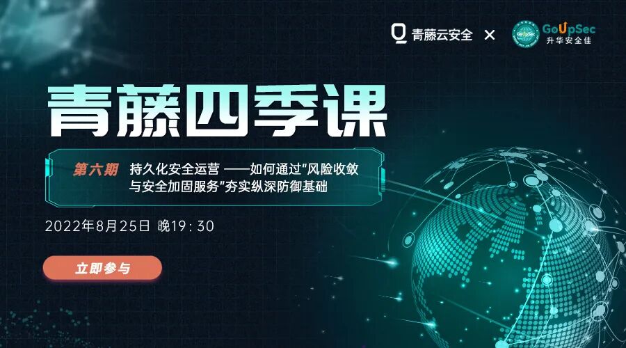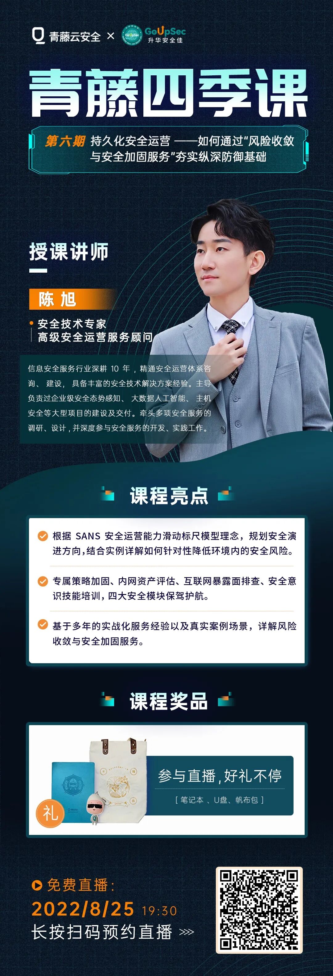 为了让大家能够对防御有更深的了解和深入的学习,青藤云安全联合GoUpSec精心打造了【青藤四季课】——第6期:《持久化安全运营--如何通过“风险收敛与安全加固服务”夯实纵深防御基础》,本次讲座邀请到的是安全技术专家/高级安全运营服务顾问——陈旭,带领大家一起,围绕以下三个维度为大家展开讲解,共同探讨和夯实防御基础!