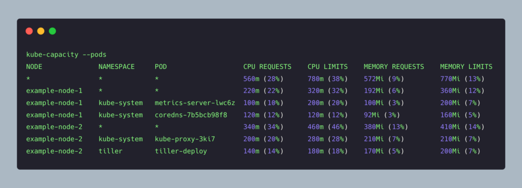对于更详细的输出,kube-capacity 可以在输出中包含 pod。当-p或--pods被传递给 kube-capacity 时,它将包含如下所示的特定于 pod 的输出