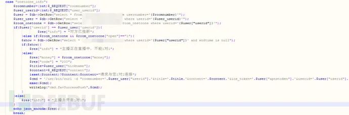 继续搜索到exec时发现有一处命令执行漏洞,代码如下:整体代码逻辑是先判断请求参数action,action值为onetoone_info就走入这个代码段,然后查询用户id和房间号。这里需要自己登录一个账号,还需要通过遍历找到一个符合条件的房间号,否则无法往下走,之后绕过两个if,走到else的代码段,可以看到有个exec函数,函数的参数$cmd里有个$content是可控的: