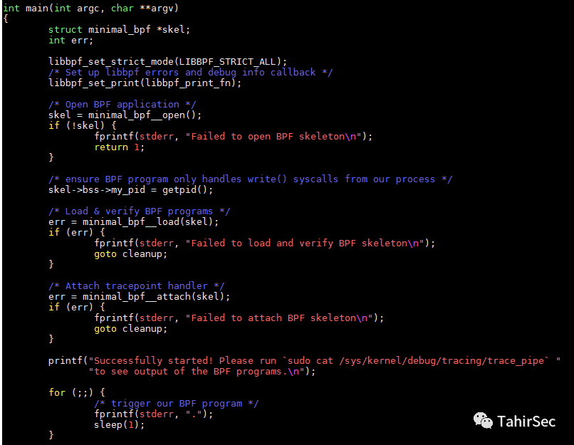 /* Attach tracepoint handler */err = minimal_bpf__attach(skel);if (err) {fprintf(stderr, "Failed to attach BPF skeleton\n");goto cleanup;}printf("Successfully started!\n");