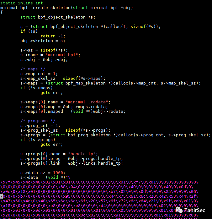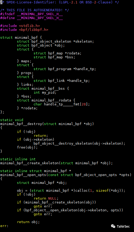 #include "minimal.skel.h"minimal.skel.h头文件包括 BPF 代码的 BPF 框架minimal.bpf.c。它由 bpftool 在 Makefile 中自动生成的,它还将编译后的 BPF 目标代码的内容嵌入头文件中来简化 BPF 代码部署工作,该头文件包含在用户态代码中。无需在应用程序二进制文件中部署额外的文件,只需包含标头就可以了。