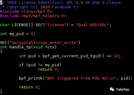 int handle_tp(void *ctx){int my_pid = 0;int pid = bpf_get_current_pid_tgid() >> 32;if (pid != my_pid)return 0;bpf_printk("BPF triggered from PID %d.\n", pid);bpf_printk("Hello World!");return 0;}