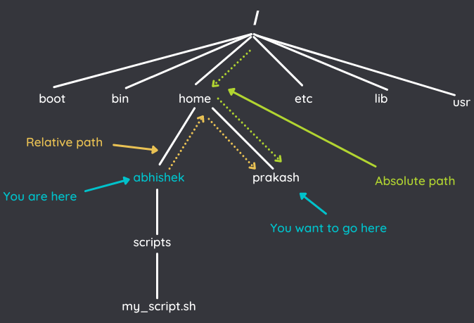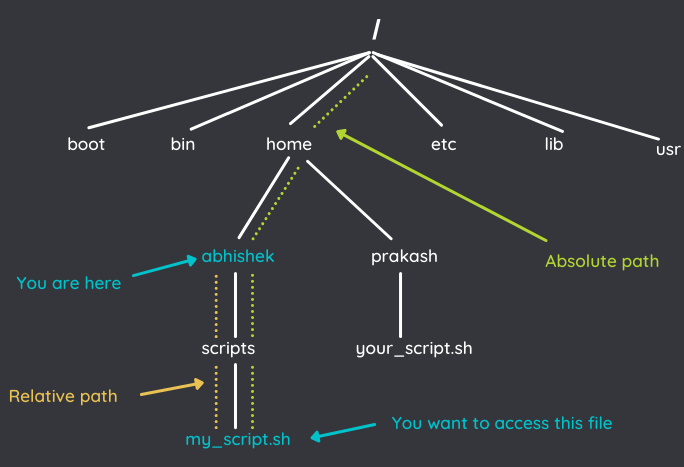 假设我们现在目录abhishek中,并且希望访问文件my_scripts.sh,如下图所示两种路径的表示: