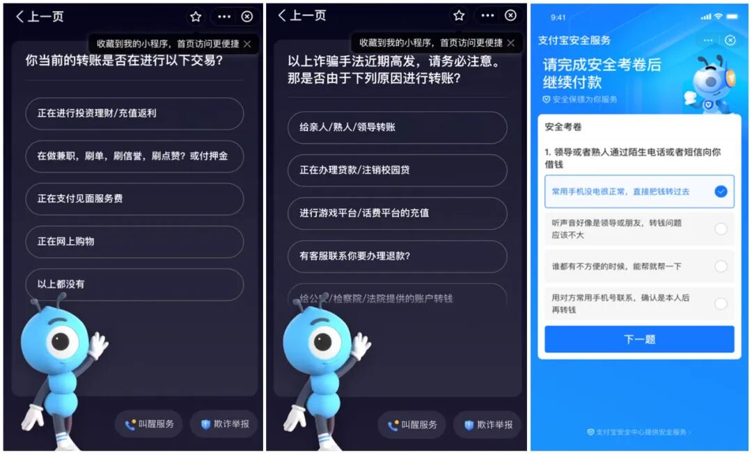 让用户意识到被骗,这显然超越了技术人熟悉的代码对抗,进入了心理学的范畴,难度完全未知。。。李俊奎他们也犹豫了好久。不过,最终他们还是说服了自己,不会就学,不懂就问,干是一定得干!哪怕能多救出一个被骗的人,也是多一份的功德。在刚才的科普中,我们的门神一直被绑着手脚,绑的时间长了,总得松开活动活动。。。面对用户深度被骗,执迷不悟的情况,门神的选择是——忍无可忍,无需再忍。让用户从被骗的“懵逼”状态醒悟过来,需要给他来一个“当头棒喝”。可是,经过一段时间的实验,老师傅发现看到提示就放弃转账的比例停留在了10%的水平,其余90%的人还是会再次尝试转账。他们觉得也许是提醒文案不够刺激。于是专门找到浙江大学的心理学专家,一起合作重新设计更符合心理的提醒文案,还加上了警察叔叔的萌萌哒头像。可是,文案修改虽然能微弱提升拦截率,但还是没办法突破瓶颈。设身处地想想,一般人看到一堆字就直接闭眼跳过,根本不会走心。。。而且,在深度受骗中的人,大多还是老年人,眼神本来就不好,就更没有闲心阅读理解了,稀里糊涂还是把钱给骗子转过去。于是,他们改变了提醒的方法,每当发现用户被骗试图转账,就让支付宝的客服人员直接给用户打电话劝阻。因为风控系统已经根据信息大致判断出了诈骗的类型。所以客服一上来就能跟用户来个“情景还原”:是不是有人推荐你投资理财了?是不是说几天就能翻一倍?真人的声音果然比文字好使多了,很多受骗的人接到电话都会猛然一愣,聪明的智商开始重新夺回高地。但是,团队很快就发现,这样一个个叫醒,太耗费人力。尤其是碰到深度被骗的爷爷奶奶,要纠缠很久。。。这样下去,有多少客服都不够啊。。。跟心理专家讨教了很久,老师傅逐渐确认,叫醒热线之所以能点醒梦中人,归根结底是和被骗的人产生了“交互”,你有来言,我有去语,他的思路就有机会离开骗子的掌控。反诈团队受了启发,开始研究一种叫做“交互式主动风控”的东西。简单来说就是,一旦感觉用户被骗,不是给 Ta 打电话,而是弹出一个(无法跳过的)界面,这个界面会代替客服人员,向用户提问,Ta 必须全部答完,才能继续转账。注意,这些问题绝非“例行公事”,而是根据 Ta 被骗的类型,用人工智能实时生成的问答题,每一个被骗的人,看到的问题都和他正在遭受的诈骗息息相关。其实,引导用户自己反思,只是“交互式风控”的目的之一。它还有一个更主要的目的:根据用户的回答情况,进一步判断用户被骗的“置信度”有多高。这就是“意图识别”。支付宝觉得A用户这笔转账被骗的概率有60%,于是弹出“交互式风控”页面。看完用户的回答,就已经有99%的信心确定用户被骗了。他不仅要拼死拦截这笔转账,还可能要把这笔资金冻结24小时,以防用户提现之后从别的渠道转给骗子;与此同时,如果用户设置过亲情号码,支付宝还会马上自动打电话给老人的亲属或孩子;这笔转账的对手方也会马上被标记为绝对高危账户,它的一切行为都被记录在案,日后成为呈堂证供。