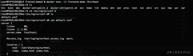 docker run -d -p 80:80 -v /Users/user/Desktop/mine/fronted-demo2/build:/usr/share/nginx/html --name frontend-test nginxdocker exec -it frontend-test /bin/bashserver {listen 80;server_name localhost;underscores_in_headers on;root /home/frontend;location / {try_files $uri $uri/ @router;index index.html;}location @router {rewrite ^.*$ /index.html last;}}
