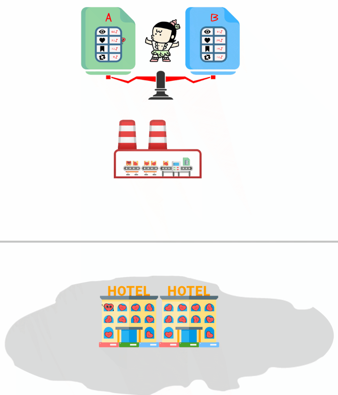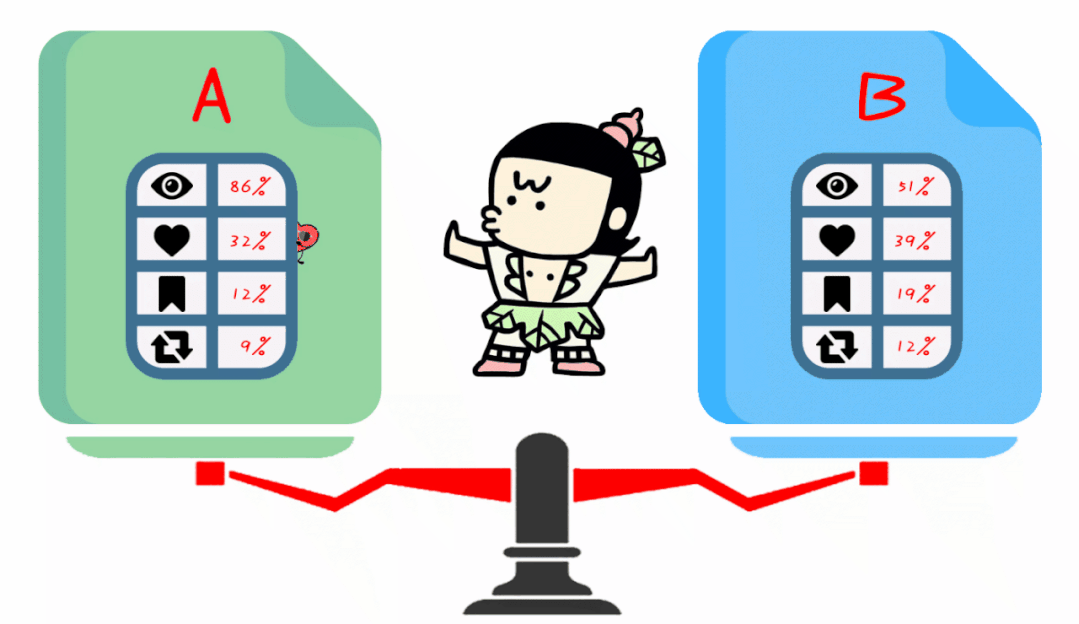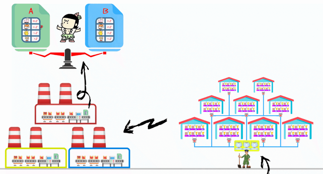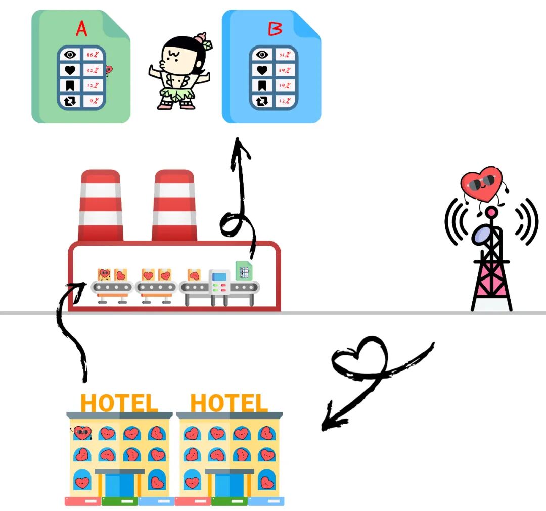 一个人一生几亿次投票汇总下来,其实就是他的墓志铭;而无数人的墓志铭汇总起来,就是我们世界的历史线。如此看来,我们颅内的每一次渺小“投票”都像是给世界输入了一个“数据”,最终会导致这个世界输出的“结果”有一丝丝偏转。可坏消息来了:我们的物理世界是没有“存证机制”的。你做了好事不一定被人看到,被人看到不一定被理解,被理解不一定被赞扬,被赞扬不一定被效仿,被效仿时又不一定被下一个人看到。。。于是,这种“数据”的传递慢得惊人,留存准确度也低得惊人。以至于,“善恶有报”这件事情虽然在逻辑上隐约成立,却在一个人的生命跨度里基本无法被观测到。2022年的我们,不是全无选择——除了破旧的物理世界,还有崭新的数字世界。在数字世界里,事情就大快人心得多。每一个字节的数据都可以被分毫不爽地高速传递,进而确定性地、可以量化地对这个世界造成改变。在物理世界,你看到一个人扶起了摔倒的老奶奶,你对着他比了一个赞,然后就没有然后了。可是在抖音上,你看到一个人扶起了摔倒老奶奶的视频,你点了一个赞,这个赞就会像一枚钢印刻在数据库里,推动系统把这个视频推荐给更多人看,最终成为更多人心头的一个善念。你看,正是有了数据,数字世界才有了比现实世界更大的演化动力。所以,把数据称为数字世界的石油简直不要太合适。遗憾的是,纵然数据是个宝,但不同人对它的态度是不同的。就像石油一样:在原始部落看来这就是黑乎乎的沼泽,弃之如敝履,因为他们无法利用;但对于工业体系完善的国家来说,就会对石油颇为“礼遇”,因为他们懂得如何冶炼它。那么此时此刻的数字世界,对数据最为礼遇,最会从数据中提炼能源的是谁呢?我认识的字节跳动的老师傅不算多。但这些人却有一点出奇地相似,就是他们都极其尊重数据,甚至说“信仰数据”也不过分。你看,2012年他们起名的时候就把公司直接叫成了数据的计量单位“字节”,可见从第一集就奔着西天取经去了。。。这几年字节的老师傅们开发了好多有趣的技术,目的就是“三最”——用最高的规格,把数据冶炼成最纯的能源,发挥出最大的价值。这些技术,组成了一个“旅行社”,把小红心的旅途安排得明明白白。好了,估计你已经对小红心的奇幻之旅有那么一点好奇了~~为了深刻体会数据技术的历史脉络,我决定带你重走一遍老师傅的取经路。2015年,抖音还没出生。但没关系,它的大哥今日头条已经诞生了。假设有人给某篇头条文章点了赞,也会产生一颗小红心。1、它睁开了双眼,还没来得透过屏幕仔细看清主人的模样,就嗖地一下被甩到空中。空中的基站像弹弓一样,迅雷不及掩耳盗铃地把它弹射到轰鸣的服务器中。2、在服务器中,小红心见到了和它一样的来自各地的数据,它们列队整齐,被安排入住在一个叫做”数据库“的巨大酒店里。3、这个大酒店里好吃好喝,但就是有些寂寞,各个数据也相互不见面。小红心本以为自己就要在这里颐养天年了。但是,几天之后,它却收到邀请,要去参加一个有趣的游戏。原来,字节的老师傅们写了一个系统,用来把“A组文章”和“B组文章”的阅读情况分别进行汇总。我们的主角小红心恰恰属于A组文章的点赞数据,于是,它和其他众多数据抱在一起,坐在了数据工厂的流水线上,从另一端出来时,它变了模样,成为报表的一部分。不瞒你说,这是字节这群老师傅在练绝招:“A/B测试”。当时的情况大概是:今日头条刚刚开发出两种文章的推荐策略,可这两种策略哪种能把文章*更精准*地推荐给想看它们的人呢?老师傅们选定两组用户,先分别用A、B两个策略为他们推荐文章,然后把这两组文章的点赞、阅读时长等等数据汇总起来,哪个策略返回的数据更好,不就说明它干活儿更棒么?看到这,你可能撇嘴:这不就是简单的对比实验么,算啥绝招?客官有所不知,“A/B测试”从实验设计到数据汇总,是一个贼拉费劲儿的事情。你遇到“午饭吃麦当劳还是肯德基”这样的抉择,肯定不会做个实验,把两家的汉堡薯条都买来,对比谁家的薯条多,谁家的汉堡大,你最多扔个鞋决定一下也就完事儿了,只有遇到重大抉择才会想到用“A/B”来严肃地解决。图片来自“毕导”,他曾经真的测试过哪种快餐更合算。。。文章链接我放在最后吧。可字节这群人却都是“A/B狂人”,买汉堡前先做实验这种事儿他们没准还真能干出来。。。在字节公司内部,流传着一个“黑话”——遇事不决用A/B。大到推荐引擎的策略调整,小到App里一个按钮的位置摆放,各种改进,总要设计个实验看看回收数据才能放心,可见“数据测试”已经写入这帮人的DNA了。。。如果把做今日头条比作打一场游戏,那么每一次“A/B测试”就相当于一个“存档点”。在AB两种策略里选优就相当于——“这里打得不好,读档重来再打一次”,每次都在“打得好的那一版”的基础上继续往前打。最终,一点点优势累计,就必然形成数学上的巨大胜率。相比其他一条命拼到死的竞争对手,你说它不胜出谁胜出?所以,“用A/B”不是绝招,“总用A/B”才是绝招。可字节跳动这帮人“开挂”也不是没有代价。还是刚才说的,实验设计太太太太太费功夫。。。他还记得那个“震撼”景象:所有的数据报表都是同事们用邮件传来传去,手动比对分析。这种小米加步枪的状态下,负责技术的老师傅就比较惨:今