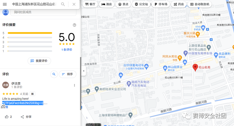 根据题目信息推测出在上海,通过一家农夫生鲜水果店,找到对面的小区,在地图评论区找到flag
