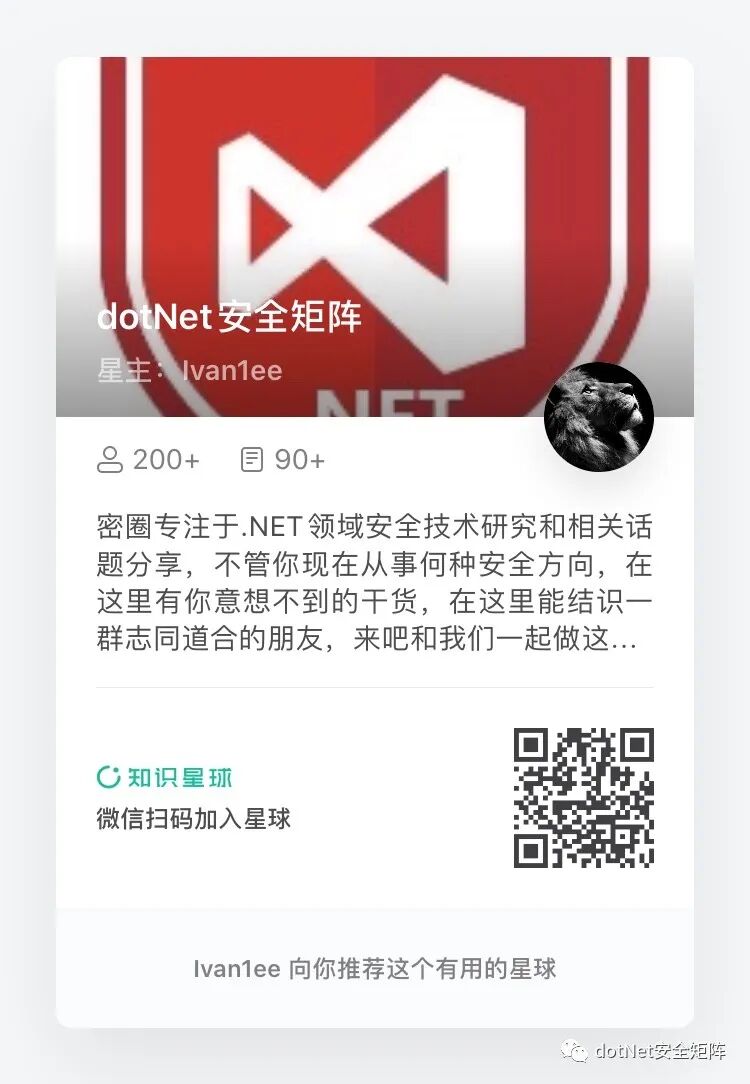 dotNet安全矩阵知识星球 — 聚焦于微软.NET安全技术,关注基于.NET衍生出的各种红蓝攻防对抗技术、分享内容不限于 .NET代码审计、 最新的.NET漏洞分析、反序列化漏洞研究、有趣的.NET安全Trick、.NET开源软件分享、. NET生态等热点话题、还可以获得阿里、蚂蚁、字节等大厂内推的机会.