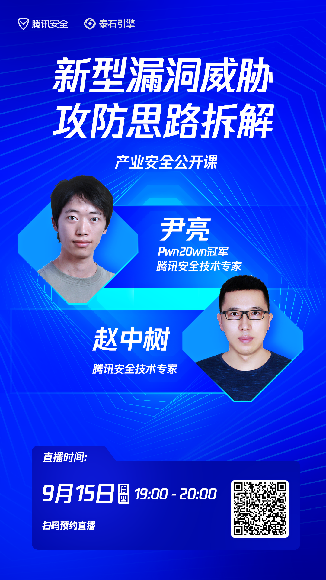 9月15日(周四)19:00,腾讯安全将带来《新型漏洞威胁攻防思路拆解》主题公开课邀请尹亮、赵中树两位深耕网络安全行业10余载的腾讯安全技术专家带来分享深入剖析漏洞攻击典型案例及腾讯防护新思路,帮助企业从攻击者视角,评估现有漏洞管理方案的提升点,补齐漏洞防护短板。